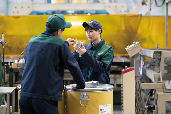 日々改善。社内改善から発想力を身に付ける 日々改善。社内改善から発想力を身に付ける 当社ではすべての社員が1年間に4件の改善提案を提出しています。その中から優秀作品を選出し、年1回全社で発表、優秀作品は表彰されます。改善内容の多くは安全に関すること、原価の改善、歩留まり改善、そして効率化、標準化やマニュアル化などです。その中でも最も多いのは安全に関することです。安全意識を高く持つということは、製品を開発する上で最も大切なことです。安全に作ることができるのか。製造現場が安全であるということは、安心して働く場があるからこそ、安心してより質の高いものを製造することができます。 安全に供給できるのか。原材料は安定的に入荷でき、価格は安定しているのか。そして、製品は安全に使えるのか。お客様の安全は、製造業には最も大切なことです。この改善活動から新たな製品を生み出したり、直接製品の改善へと反映されたこともあります。日々の気づきより良くしていこうと言う意識の芽生えは、どこでどう活用できるともわかりません。また別の部署の改善が自分たちの改善のアイディアになることもあります。 アイディアや発想力をつける機会、提案力を身に付ける場としてもただ、優れたアイディアを表彰するだけではなく、互いに琢磨することにより、職場環境を良くしていく事はもちろんのこと、発想力、プレゼンテーション力を身につける場となっています。社員同士のコミュニケーションの機会にもなり、風通しの良い社風を作り上げています。